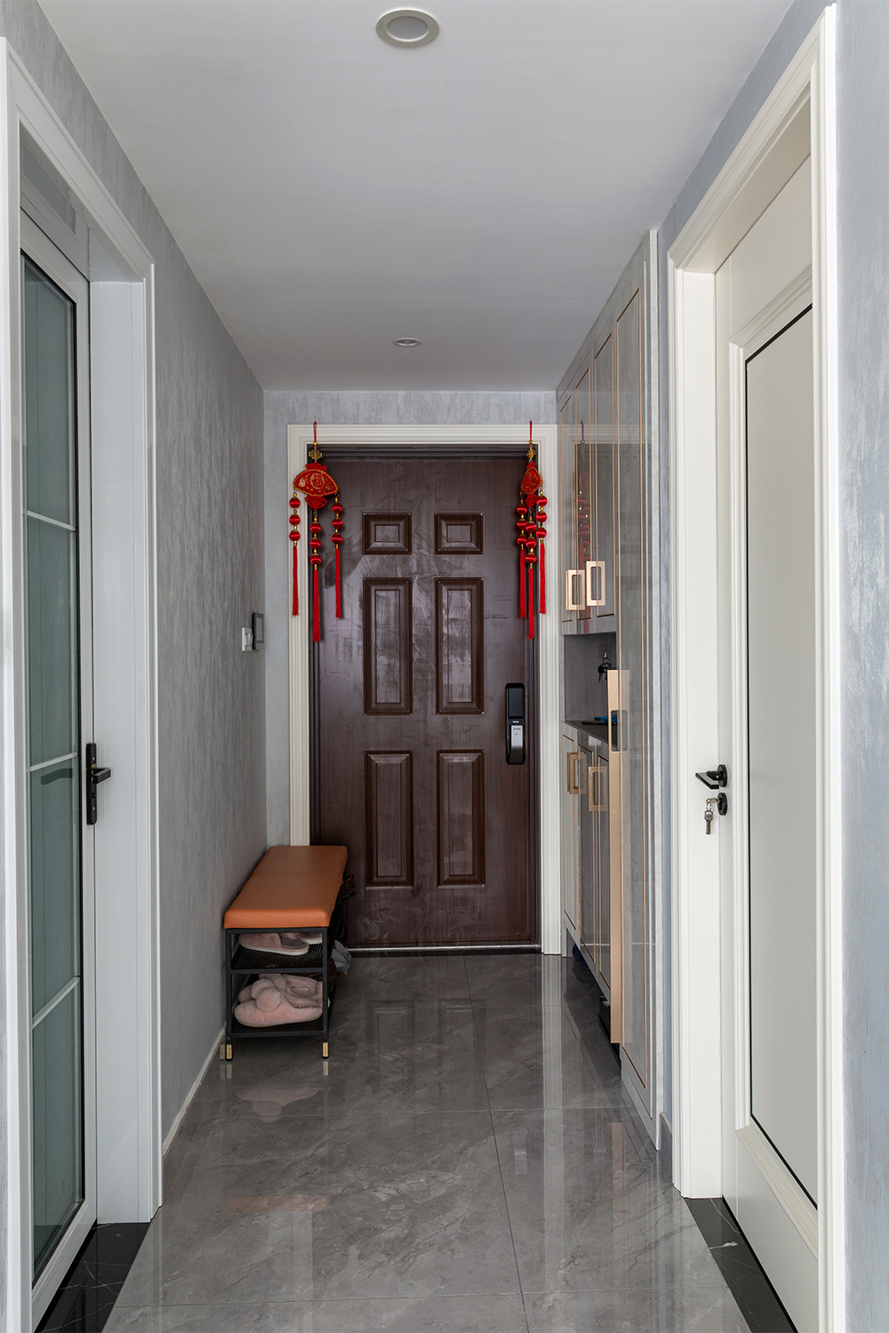 從玄關(guān)柜進(jìn)入家里。玄關(guān)柜采用嵌入式和到頂?shù)姆绞剑?jié)省空間又美觀。