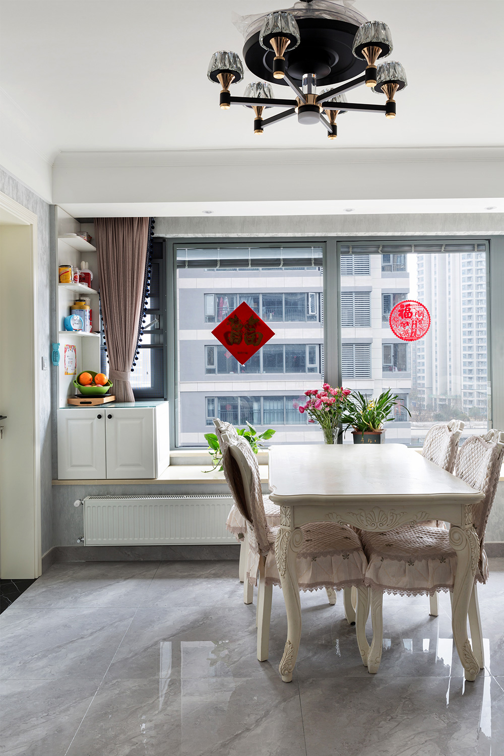 從玄關(guān)進(jìn)來就是帶有復(fù)古花色氣息的餐桌,為了留出寬敞的過道,選用輕巧的四人餐桌椅,靠近廚房的位置不會(huì)占用太多的地方,動(dòng)線緊湊方便上菜。