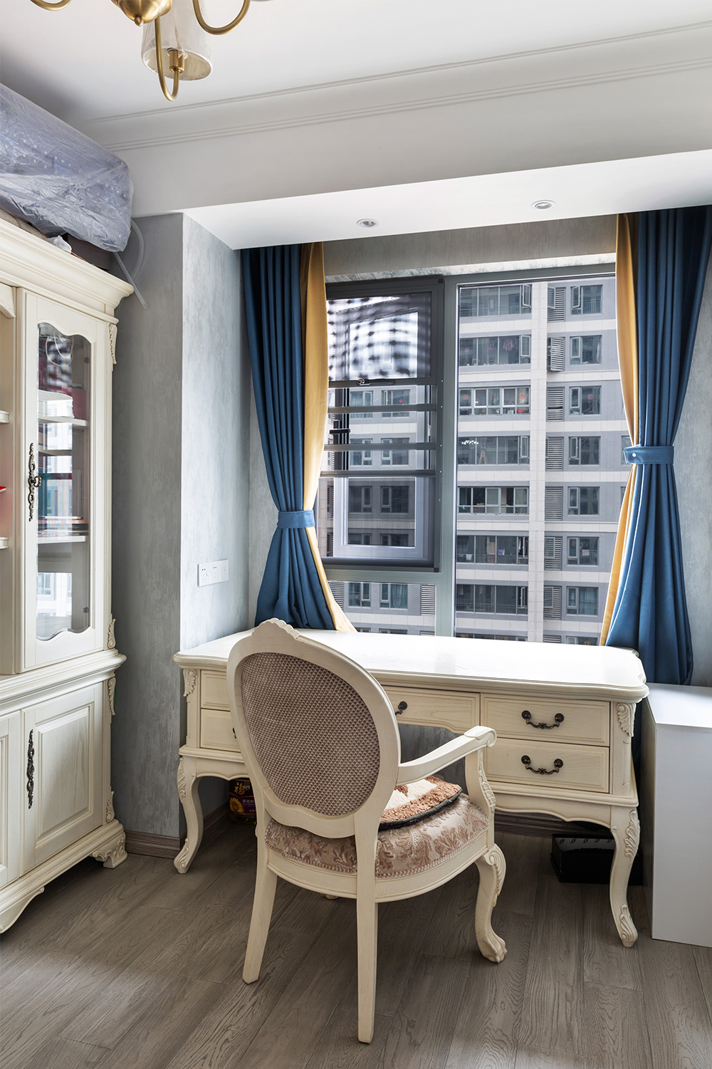 主臥沿襲了玄關(guān)柜的風(fēng)格,歐式風(fēng)格的床頭柜,墻面的金色的鑲邊,沒有太過花哨的裝飾,溫馨自然。衣柜旁的大飄窗,光線充足。同色系的裝飾畫,讓房間風(fēng)格不再生硬。