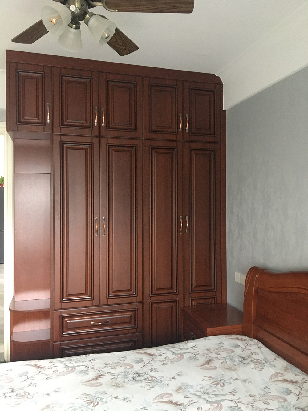 次臥采用美式風(fēng)格,到頂?shù)拇笠鹿?,在?cè)面采用半圓形分層的設(shè)計(jì),可以擺放日常物品,加強(qiáng)衣柜的儲(chǔ)存和收納的功能。