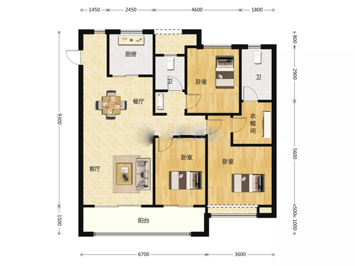 2.陽(yáng)臺(tái)連通客廳和主臥,增加采光面積和透光度。