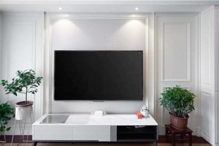 客廳整體由電視背景墻、茶幾和沙發(fā)組成,綠植和花瓶的擺放讓客廳空間熠熠生輝。電視背景墻以電視柜為中軸線,兩側(cè)打造對(duì)稱的石膏線門(mén)板的設(shè)計(jì),將背景墻連成完整的一面,與右側(cè)的餐邊柜花紋樣式相一致,在視覺(jué)上形成連貫的效果。電視柜采用的是成品家居,黑白灰三色的搭配簡(jiǎn)約卻不失格調(diào)。頂部射燈的光線向下投放,如傘狀。