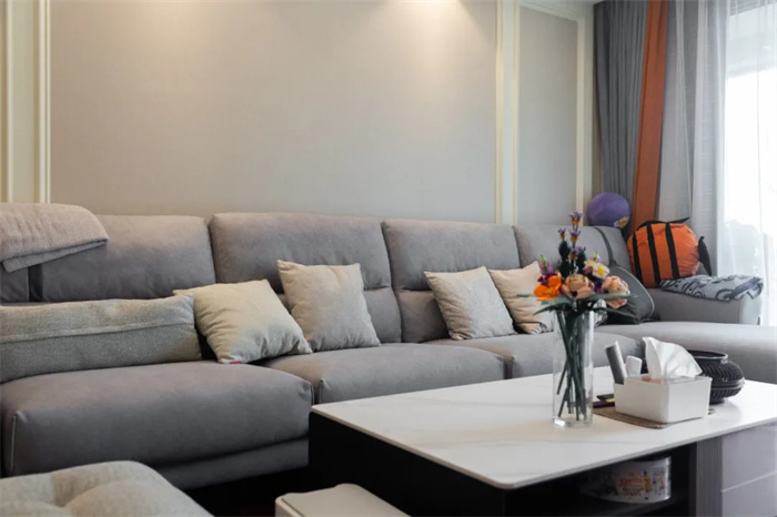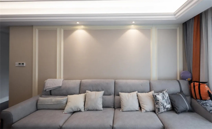 灰色系的沙發(fā),米色系的抱枕,暖黃色的射燈營(yíng)造溫馨的家庭氛圍,回到家后躺在沙發(fā)即可享受此刻的柔軟。柔和的棕色與米白色的石膏線背景墻打造仿佛融為一體,同樣是對(duì)稱的設(shè)計(jì)與電視背景墻相呼應(yīng)。如果感覺(jué)背景墻有些單調(diào),可以掛上長(zhǎng)方形的掛畫(huà)來(lái)增加空間內(nèi)的豐富性和層次感。