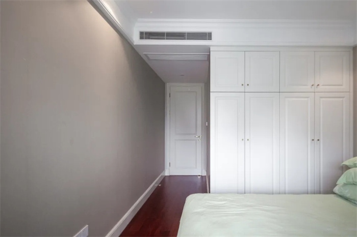 一側(cè)整面到頂?shù)囊鹿瘢瑑砷_(kāi)門(mén)的衣柜設(shè)計(jì),精美的膜壓門(mén)板花紋,給空間增添一絲層次感。金色的立體把手減少了拉開(kāi)門(mén)時(shí)的阻力。在打造的時(shí)候要注意衣柜與床鋪之間的距離,避免拉開(kāi)的時(shí)候與床邊相碰撞。