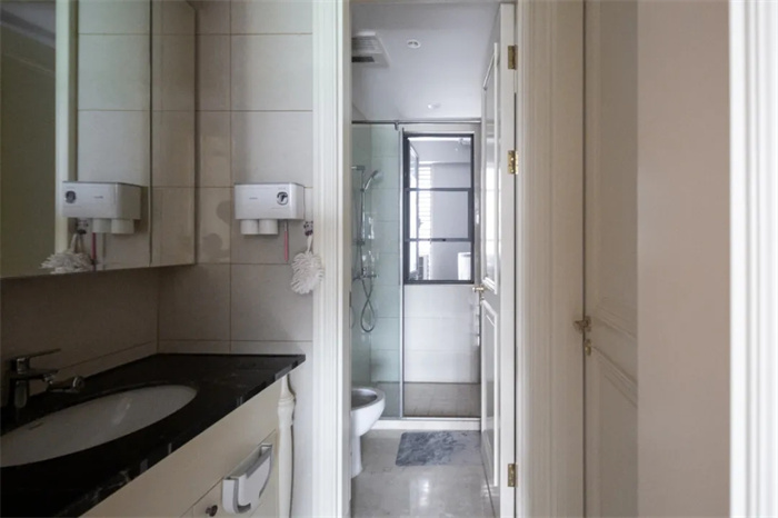 此處衛(wèi)浴間位于書(shū)房和儲(chǔ)物間的中間,透光性略微有些不充足。從衛(wèi)浴柜到馬桶到淋浴間三者按照順序有序打造, 使用起來(lái)相對(duì)方便。
