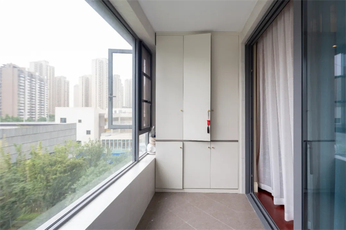 整個(gè)陽(yáng)臺(tái)具有一定的長(zhǎng)度,在另一側(cè)打造成多功能儲(chǔ)物區(qū)。門(mén)板顏色光澤度高,手感溫和,耐磨損耐用,在陽(yáng)臺(tái)處改造成為休閑區(qū),放上桌椅板凳。眺望窗外即可獲得片刻的休閑。