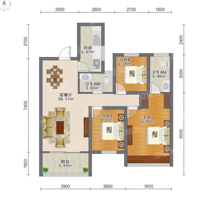 戶型圖可以大致反映出一個家的樣貌,整體來說是三室兩廳的標準戶型,進門處客餐廳共享一個大平層,走廊左側(cè)為次臥和廚房,右側(cè)為主臥和次臥兩個房間,主臥里面帶有一個衛(wèi)生間,房間規(guī)劃十分清晰。