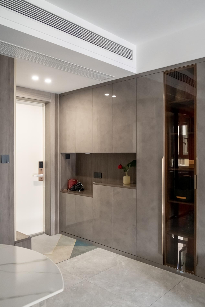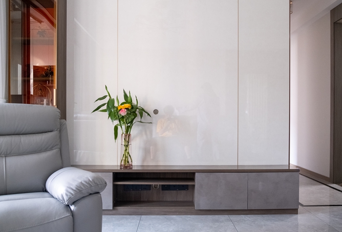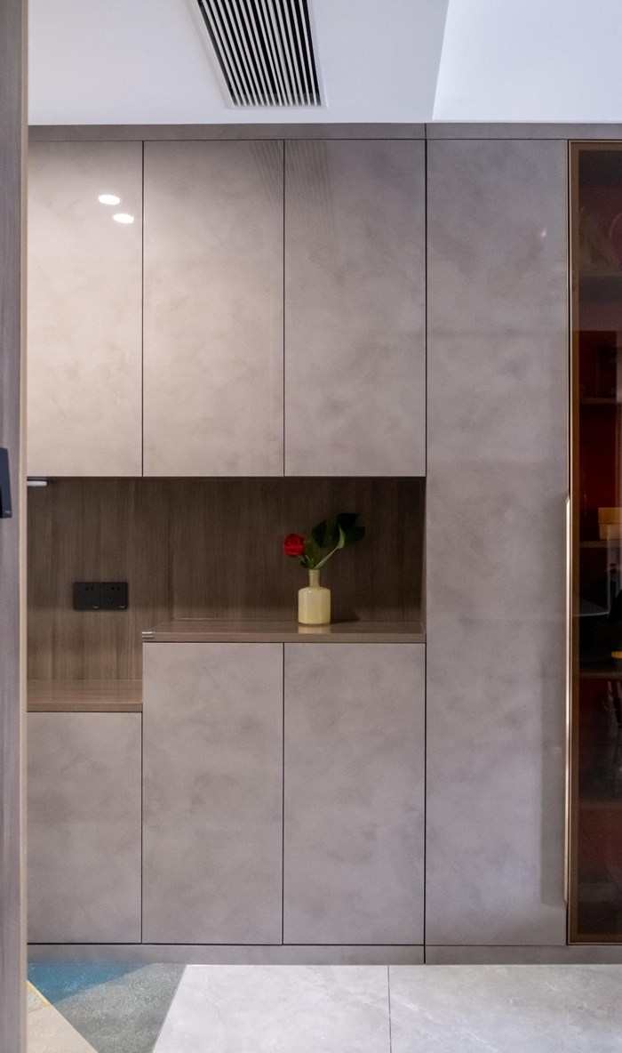 這套實體案例以簡約和多功能為主,將對家實用的內(nèi)涵貫穿始終。入戶的玄關(guān)柜便是最具有代表性的。超晶板的板材使用使表面十分透亮有光澤,板材的紋路如云霧般若隱若現(xiàn),來自客來福全屋定制的超晶板式簡約輕奢的代表,表面的光滑、清潔方便是這類板材的亮點。
