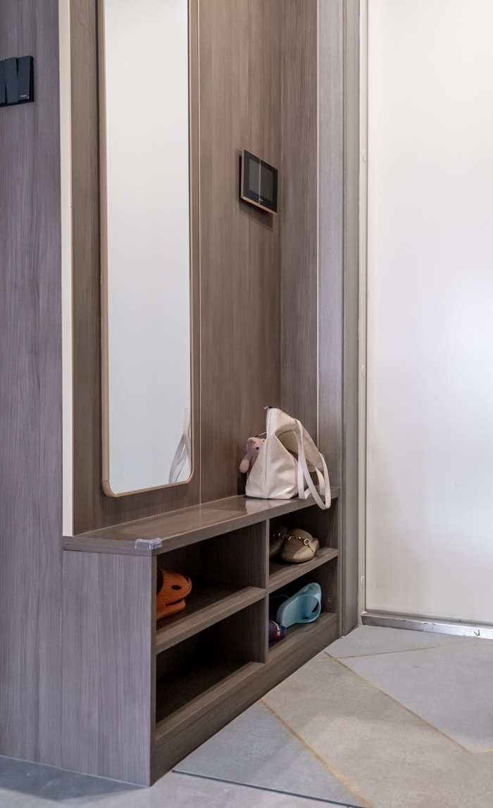 玄關(guān)柜做了從上到底的整面柜體,底部缺乏放置鞋子的空間便在玄關(guān)柜對面打造了四格的換鞋凳,也可以作為鞋柜使用,二合一的用法發(fā)揮了換鞋凳的功能。入戶處安裝了鏡子在離家上班前順手看下今天的裝扮,心情滿分的出門,玄關(guān)柜處的打造處處體現(xiàn)出細節(jié)和用心。