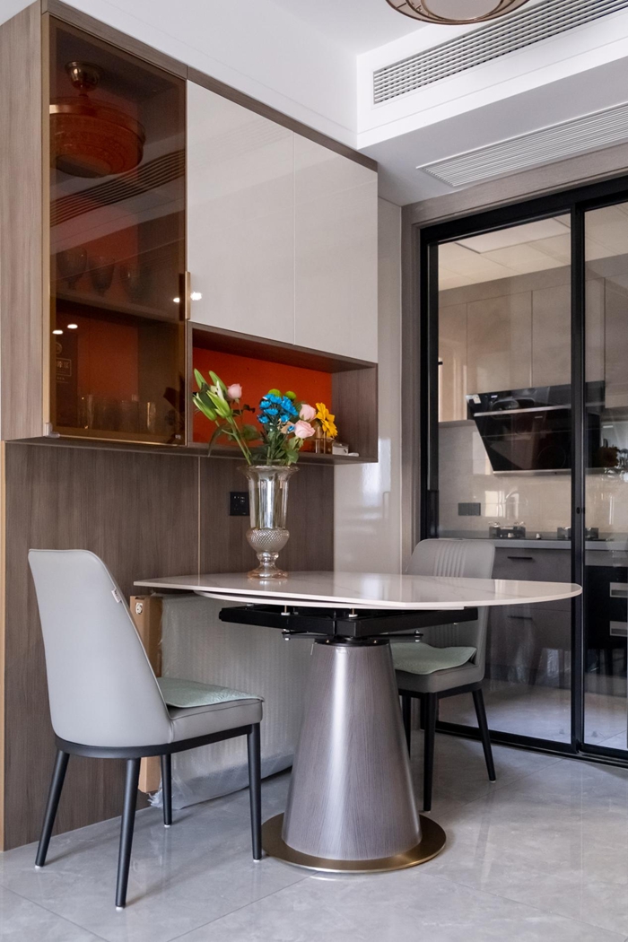 在入戶的拐彎處便是餐廳所在的位置,長方形+橢圓形的餐桌設(shè)計,拐角處圓潤可保護日常免受傷害。餐桌的上方打造四格的餐邊吊柜,符合人體高度的設(shè)計,抬手便可以拿到想要的物品,蠟燭、餐盤、餐勺一些小物品可以放在餐邊柜上,方便使用。
