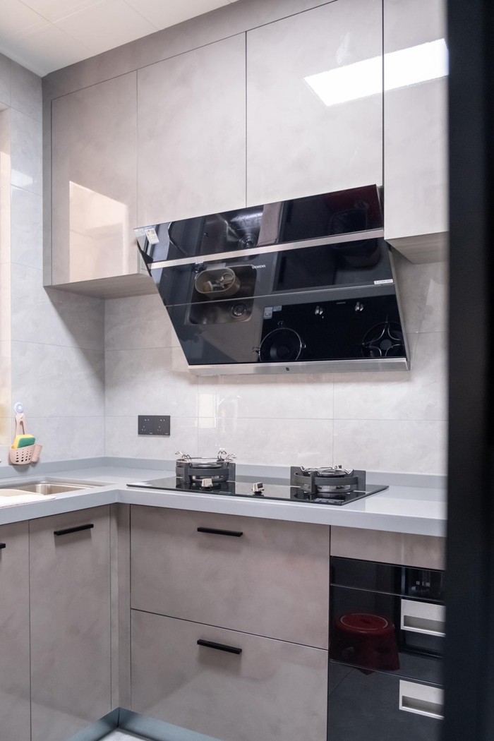 廚房處的打造簡簡單單滿足三口之家做飯的需求,在灶臺旁留出點空間便于日常飯菜的放置。上方是抽煙機,下方是放置洗碗的收納.灶臺的寬度略多于柜體中把手的寬度,在做飯時不會因為把手戳到,來來回回更加舒適。