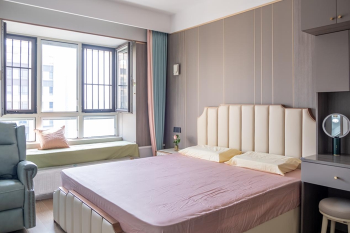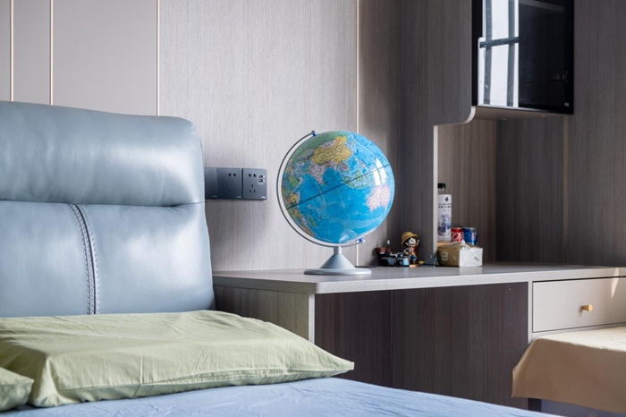 次臥處帶了一個飄窗可以打造成休閑區(qū),鋪上柔軟的床墊,在飄窗處看書、喝茶、看電視劇感受到人生的愜意。次臥處最大的亮點便是利用剩余空間進行組合柜體的打造,吊柜的設(shè)計不會占用額外的空間,但是要注意吊柜的高度,要便于日常的物品拿取擺放。