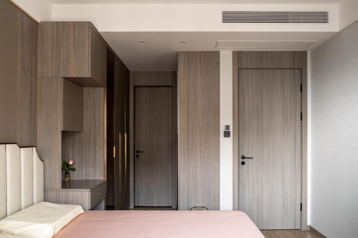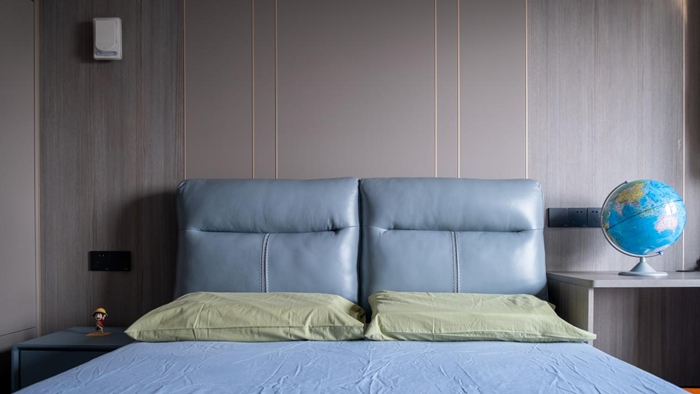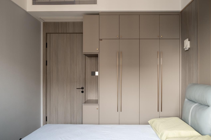 次臥相比于主臥少了一個衛(wèi)生間的空間,整面到頂?shù)囊鹿裨谧髠?cè)加了轉(zhuǎn)角衣柜的設(shè)計,為插座留出些許的空間。