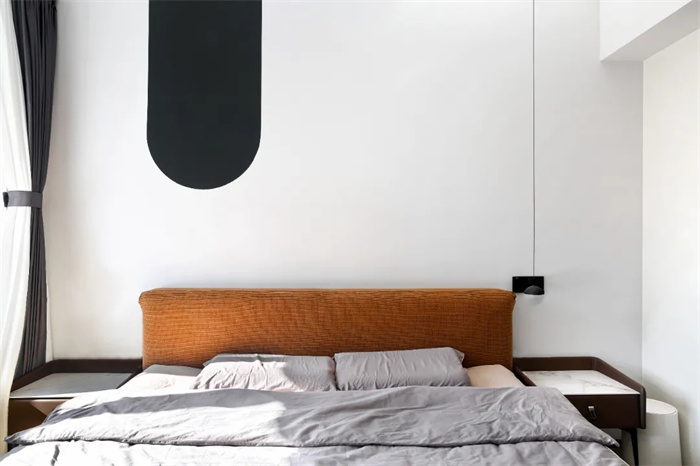 臥室大面積白色打底,愛(ài)馬仕橙的床頭套和灰色的被褥,白色+灰色+愛(ài)馬仕橙的顏色搭配彰顯精簡(jiǎn)主義的真諦。