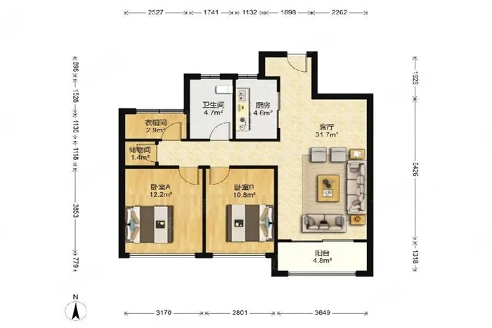 這套兩居室的戶型簡(jiǎn)單來(lái)說(shuō)便是凸字型的房屋空間結(jié)構(gòu),戶主想要增加客廳的面積,將陽(yáng)臺(tái)打通,于是客廳處總共面積為35.9㎡,在主臥處的儲(chǔ)物間和衣帽間也將兩者打通,主臥的面積為16.5㎡,滿足了日?;镜纳钚枨?。