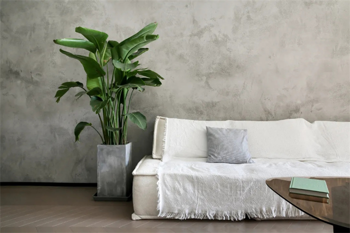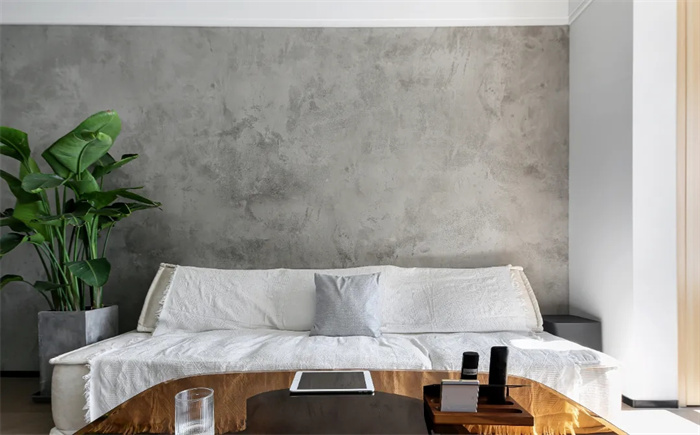 類似于侘寂風(fēng)的水泥風(fēng)格背景墻,斑駁的灰色紋路給人穩(wěn)定情緒的作用,背景墻采用的是仿真水泥墻面的墻布,比較實(shí)用且可以降低裝修成本,觸感柔軟。沙發(fā)上蓋了一條白色流蘇沙發(fā)布,以卡其色沙發(fā)套打底,整體顯得十分柔和。魚骨紋的拼接地板承襲了空間一貫的簡(jiǎn)約風(fēng)格,偌大的立體綠植給增添一抹生機(jī)。