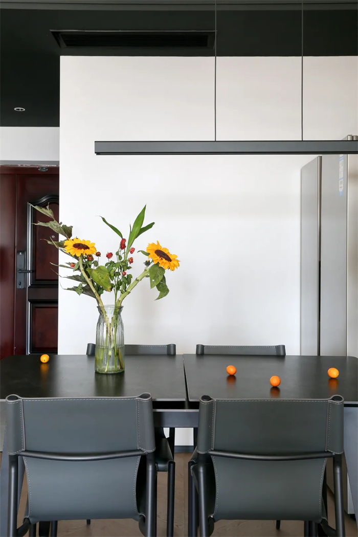 水泥灰的餐桌透露出滿滿的工業(yè)風(fēng)設(shè)計(jì),桌上擺放新鮮的花束,業(yè)主時(shí)不時(shí)會(huì)購(gòu)買新鮮的花束擺放在餐桌上,展現(xiàn)出對(duì)美好生活的精準(zhǔn)向往。