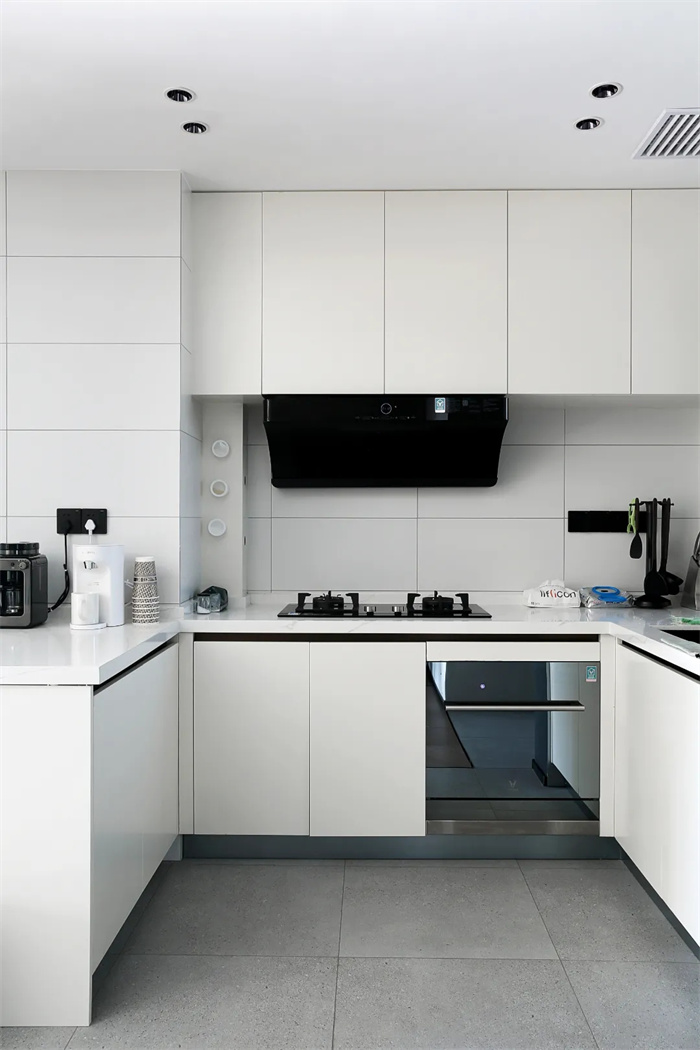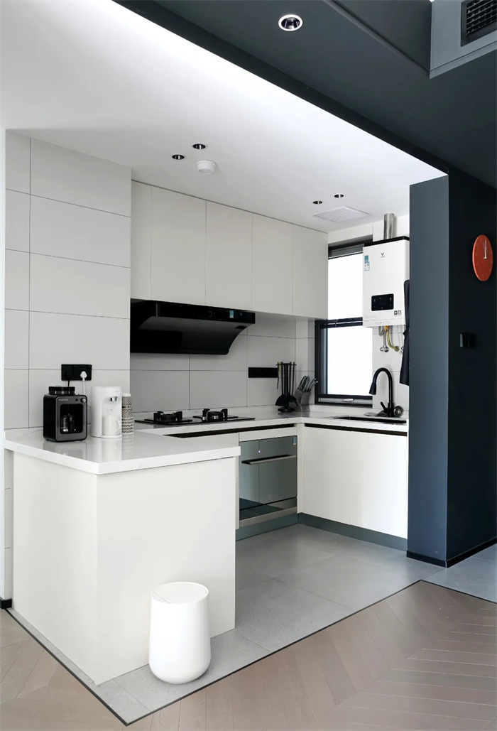 廚房在進(jìn)門的右側(cè)打造出了U字型的空間布局,類似于公寓性質(zhì)的開放性廚房,在玄關(guān)延伸出一部分墻體,在廚房格局的左側(cè)延伸一部分可以作為島臺(tái)使用,形成完整的廚房空間。
