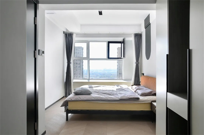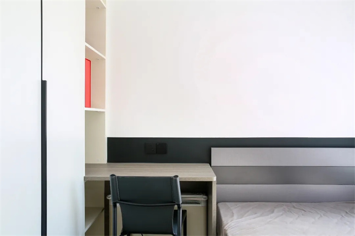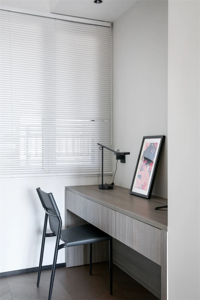 次臥同樣是采用整面到頂?shù)囊鹿瘢钆浜谏拈L(zhǎng)條把手,靠墻的一側(cè)打造成開放收納格的設(shè)計(jì),延伸的桌面下方放了暖風(fēng)機(jī)等設(shè)備,次臥格局雖不大,勝在簡(jiǎn)約。