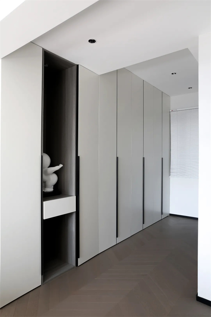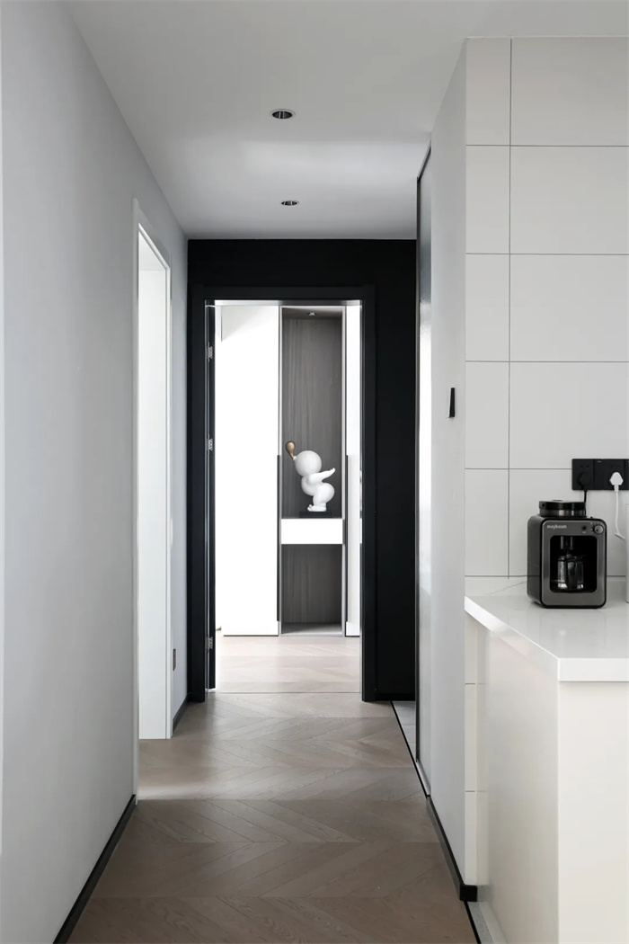 走廊空間可容納兩人并排過(guò),映入眼簾的便是拼接的魚骨紋地板,規(guī)律的拼接產(chǎn)生一種美感。直對(duì)著臥室內(nèi)的裝飾擺件,生動(dòng)且有趣。