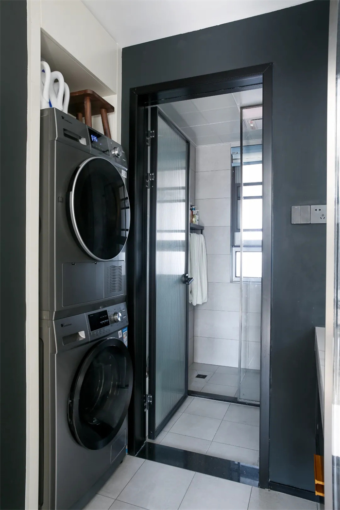 由于在陽(yáng)臺(tái)處安裝了柜體,并且留出一塊區(qū)域作為狗狗的休息區(qū),因此衣物洗滌和烘干的區(qū)域移到了衛(wèi)浴間。如果陽(yáng)臺(tái)沒(méi)有晾曬衣物的需要,日常使用烘干機(jī)可以作為替代。
