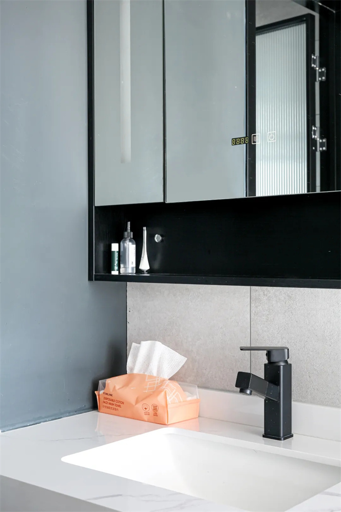 4.室內(nèi)柜體均采用芬蘭白+黑色把手的樣式,簡(jiǎn)約百搭。芬蘭白和灰橡木的柜子與極簡(jiǎn)主義所要求的色彩相呼應(yīng),整面到頂?shù)墓褡釉黾恿耸占{的空間,滿足兩人生活的收納需要。