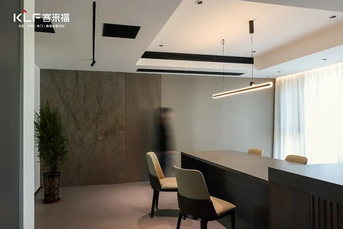 二層作為餐廚空間,圍繞簡(jiǎn)約設(shè)計(jì)理念在家居配色上以黑灰等深色系家居設(shè)計(jì)渲染整體氛圍,在墻面設(shè)計(jì)上,設(shè)計(jì)師將大理石與木質(zhì)墻板進(jìn)行結(jié)合,多重材質(zhì)組合,豐富空間元素。