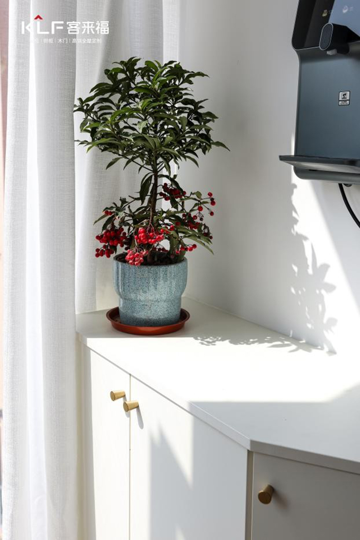 陽(yáng)臺(tái)柜設(shè)計(jì)依據(jù)墻壁走勢(shì)打造斜邊造型,芬蘭白柜體搭配古銅金小拉手,充滿(mǎn)簡(jiǎn)約法式氣息,擱置一兩盆小花,用春的鮮艷裝點(diǎn)生活。