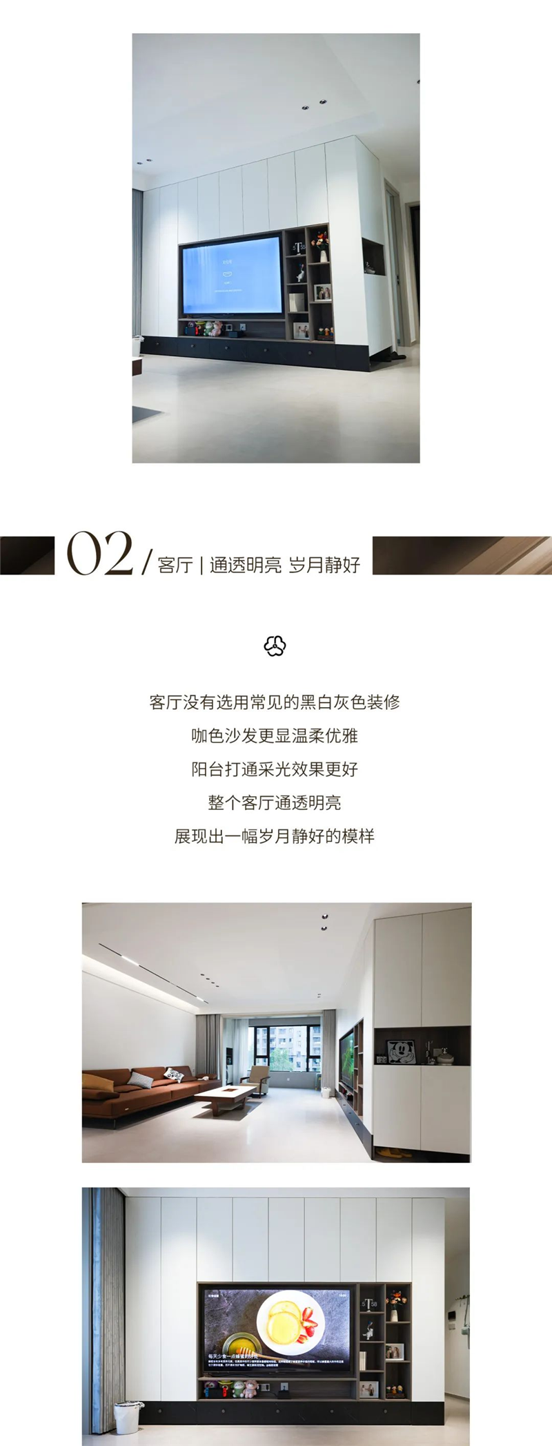 電視背景墻不設(shè)計(jì)純裝飾背景,做整面墻一柜到頂式柜子,將客廳需要收納物品放入柜中,保障了客廳的整潔度;保留開(kāi)放柜設(shè)計(jì)放置可展示物品,不僅增加客廳顏值,也減少大面積封閉柜的壓抑感。