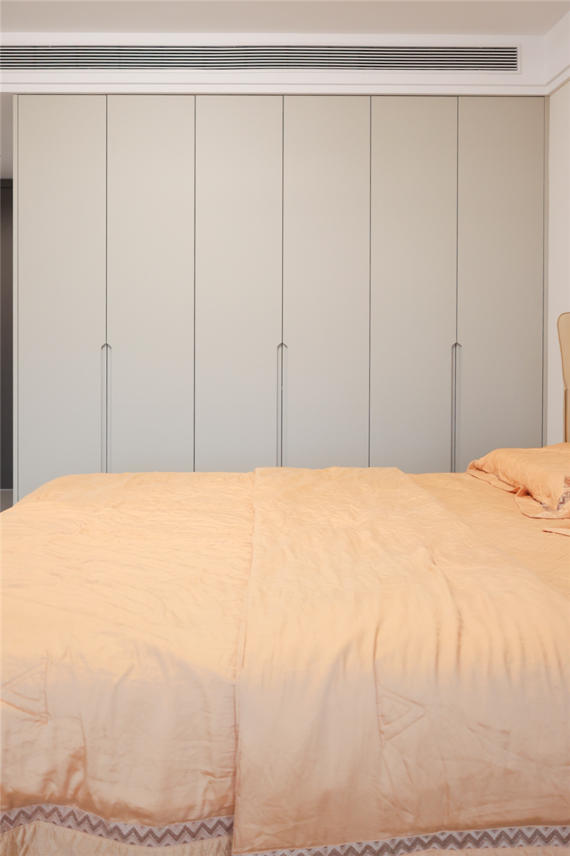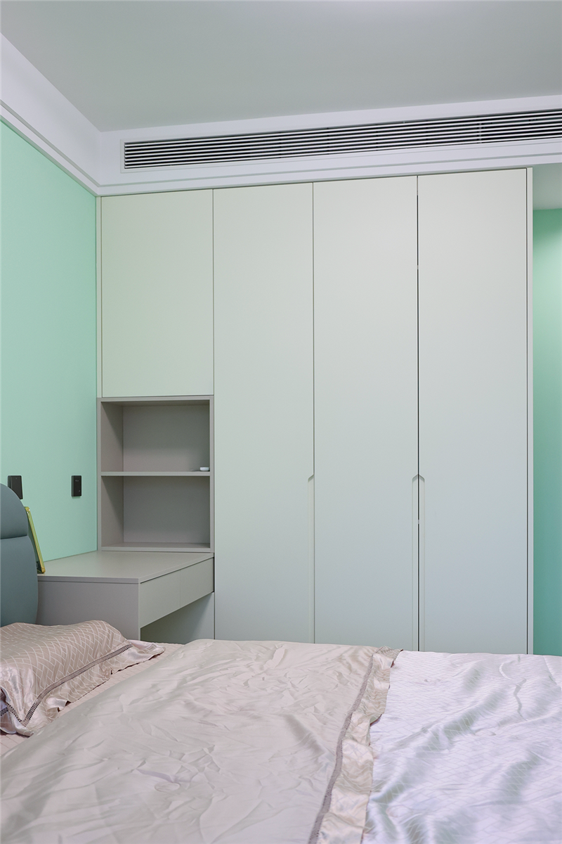 沿用主臥的一柜到頂,采用無(wú)拉手設(shè)計(jì);衣柜延伸做床頭柜,是小戶型家庭的常見(jiàn)設(shè)計(jì);整體空間簡(jiǎn)約而不簡(jiǎn)單,富含韻味。