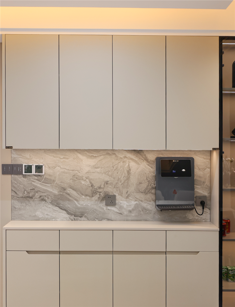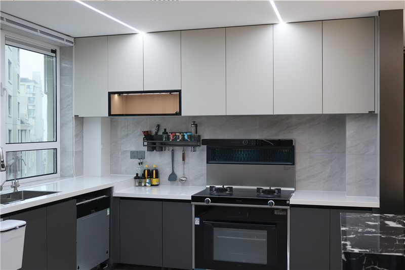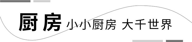 廚房貼墻打造U型深灰色櫥柜,配合茶白頂柜,融入創(chuàng)新水漆工藝,呈現(xiàn)高級(jí)美感;常見(jiàn)廚房構(gòu)造,大小戶型都適合;整體光線層次分明,使得空間清晰明朗。