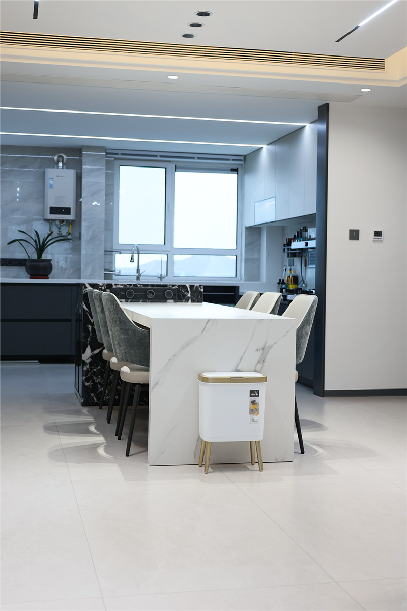一體化島臺(tái)貫穿餐廳與廚房空間,黑白色系與整體空間氛圍相協(xié)調(diào),簡(jiǎn)單而不失實(shí)用性;整體開(kāi)放式布局,以智慧動(dòng)線合理利用空間,也方便家庭成員共同參與其中。