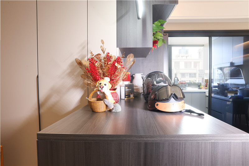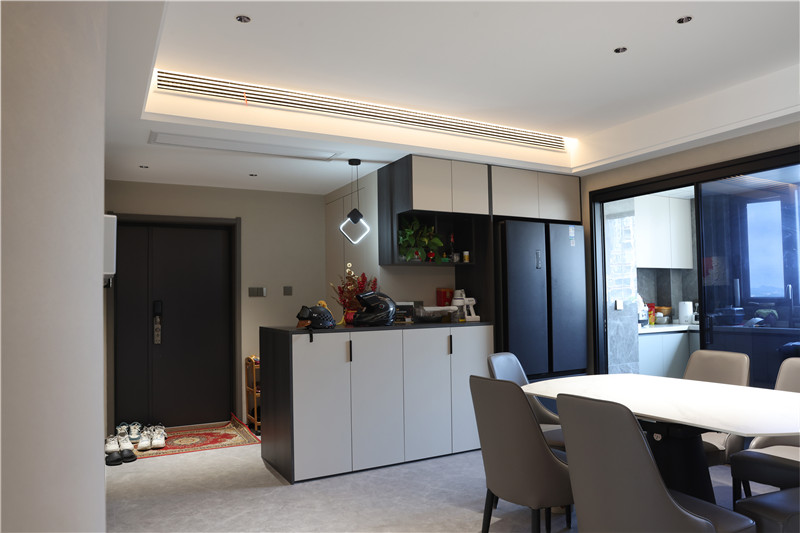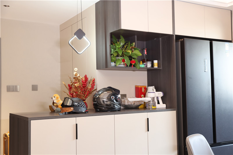 入戶柜L型設(shè)計(jì),選用客來(lái)??萍寄炯y+茶白,百搭自然;柜體設(shè)計(jì)充分利用入戶空間,一邊打一柜到頂式整面墻衣柜,增加收納能力,另一邊中部留空放置裝飾品或日常常用物品,既有顏值又實(shí)用;保證收納同時(shí)還內(nèi)嵌冰箱,為廚房減輕儲(chǔ)物壓力。