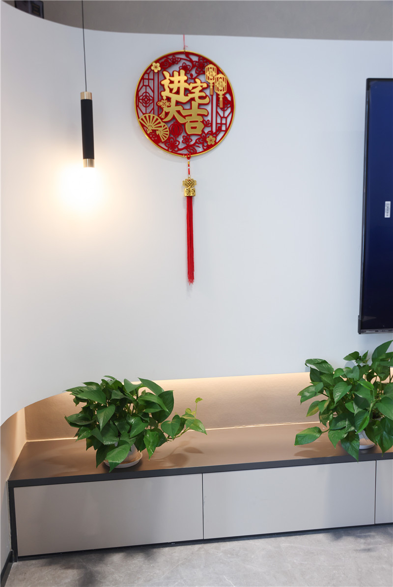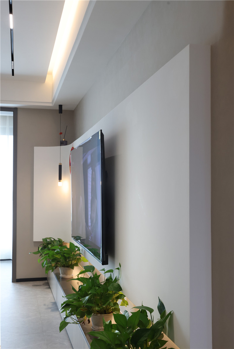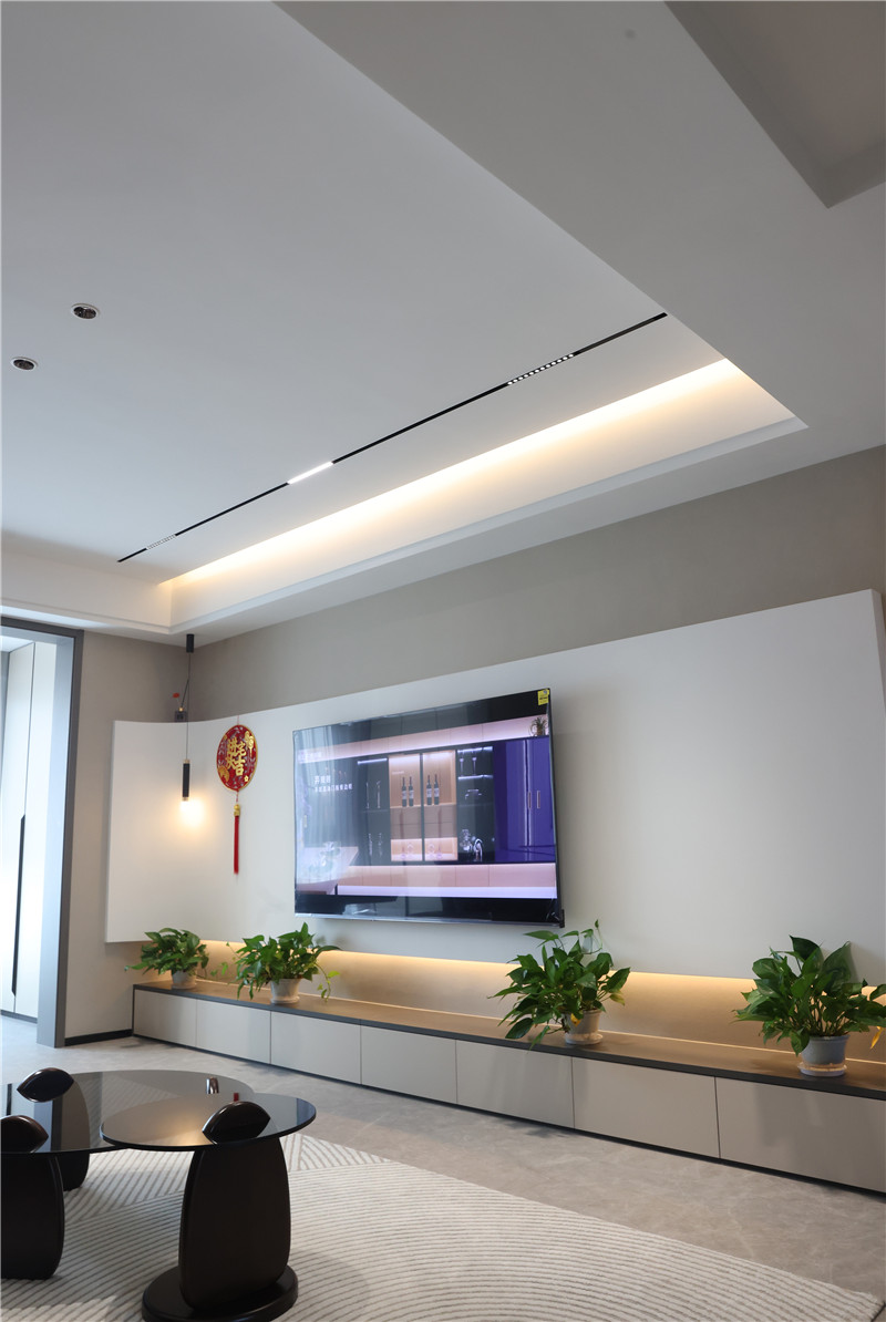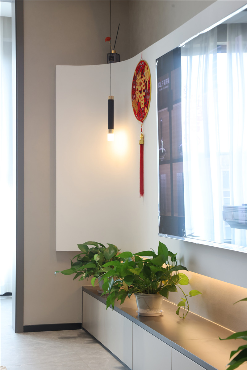 客廳作為門(mén)面擔(dān)當(dāng),電視背景墻也處于舉足輕重的地位。打破常規(guī),不參照常用的設(shè)計(jì)手法,將電視背景作弧形電視墻,通過(guò)流暢的藝術(shù)線條,達(dá)到視覺(jué)的延伸,整體更具輕盈感。