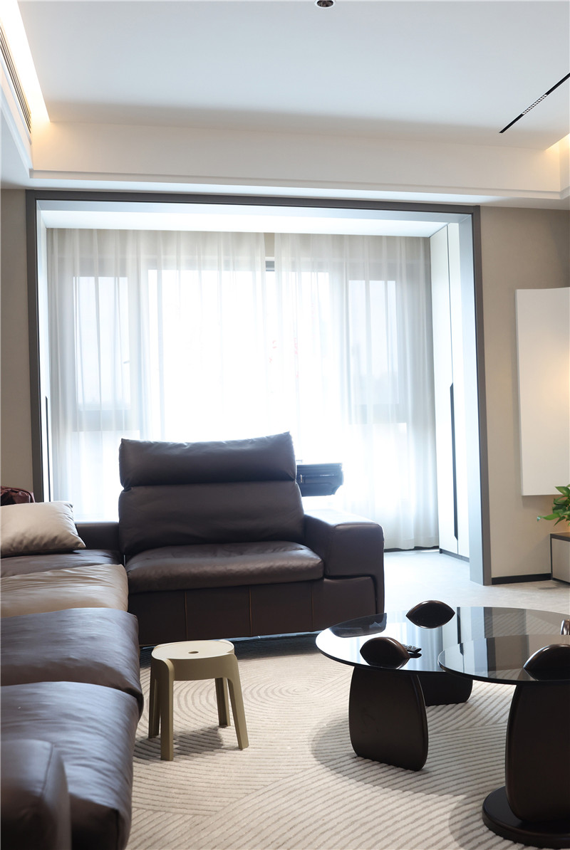 來(lái)到客廳,迎面而來(lái)是中性色調(diào)散發(fā)出的高級(jí)氛圍,黑色亮面沙發(fā)、白色曲線地毯、黑色小茶幾……整體表達(dá)出屋主時(shí)尚、個(gè)性的家居品味。