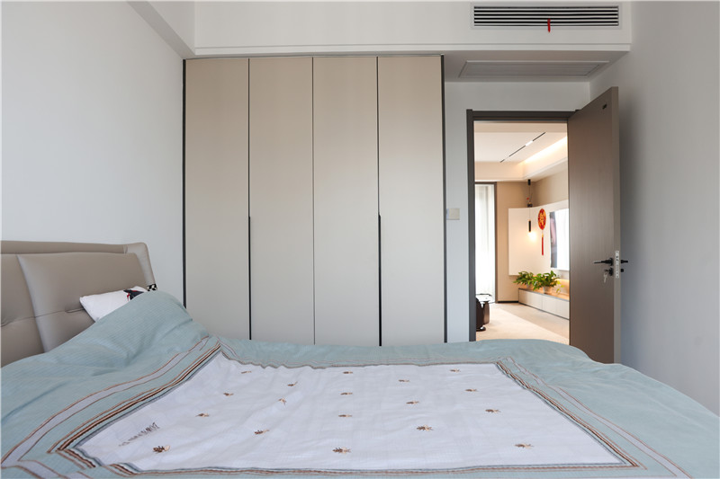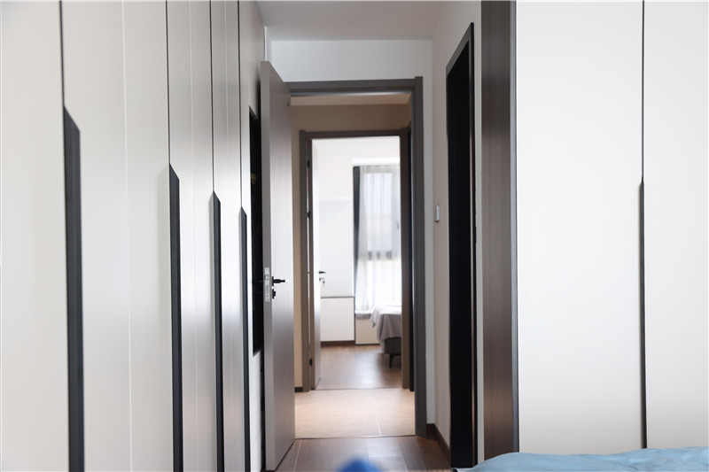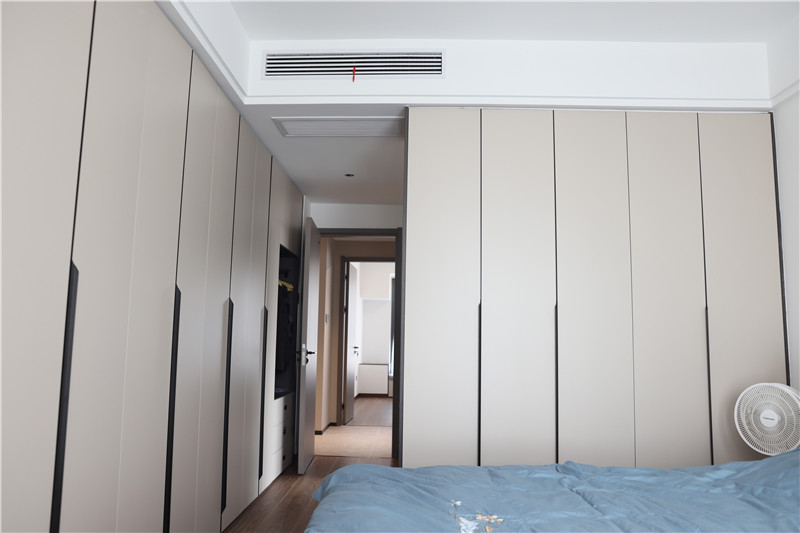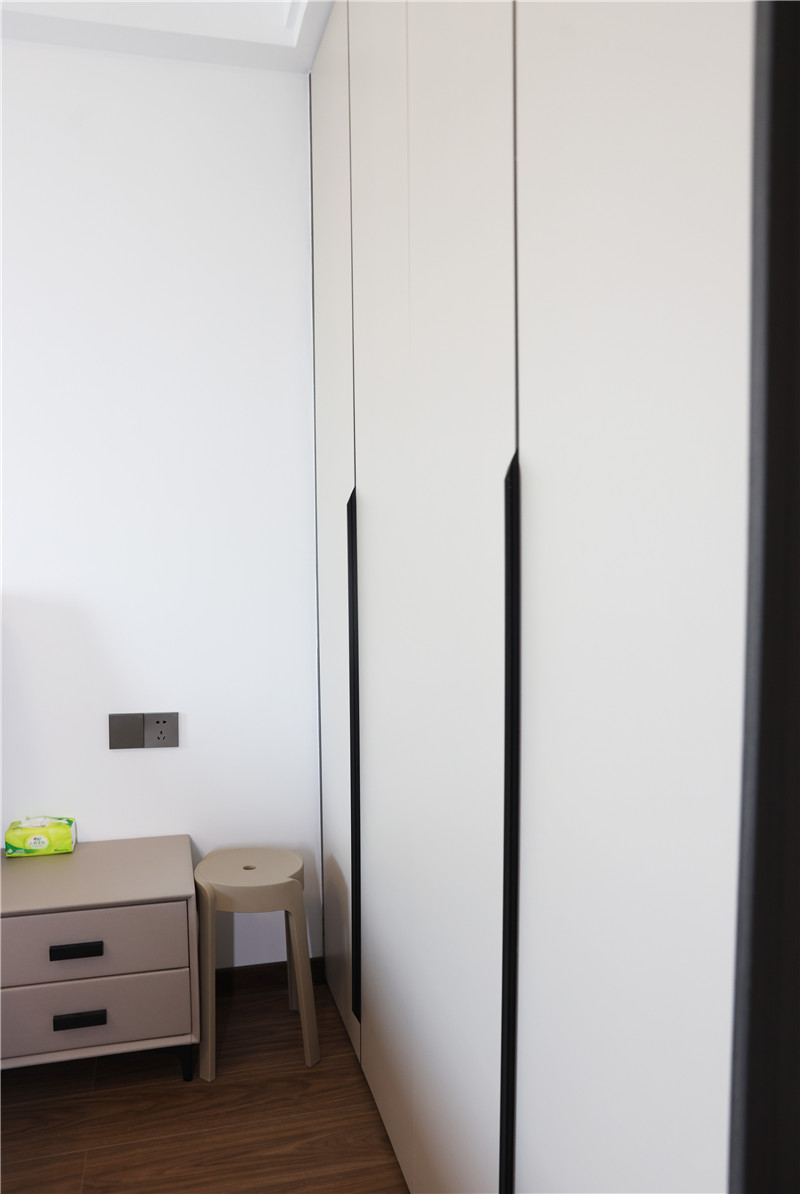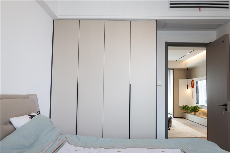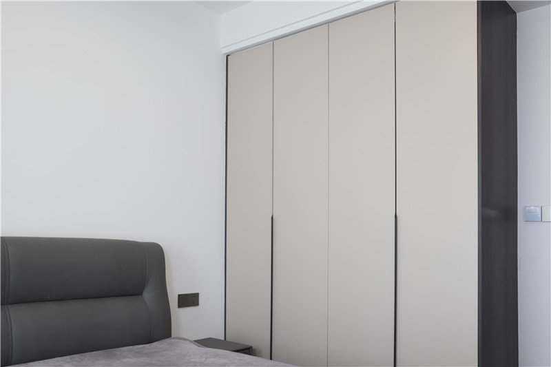 主臥與次臥根據(jù)不同人需求與生活習(xí)慣,都選用了客來(lái)??萍寄炯y+茶白,打造不同造型的柜體。衣柜擁有強(qiáng)大收納能力同時(shí),不影響空間顏值與人的活動(dòng)范圍。