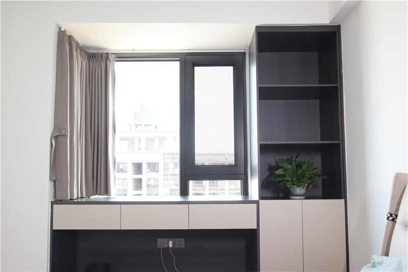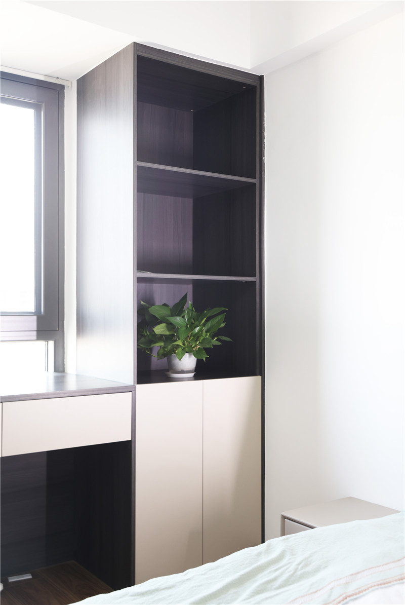 靠窗作書(shū)桌與收納柜,與衣柜選用同種材質(zhì),整體和諧統(tǒng)一。開(kāi)放格設(shè)計(jì)不僅可以充當(dāng)裝飾柜與收納柜,還可以讓空間在視覺(jué)上更開(kāi)闊。