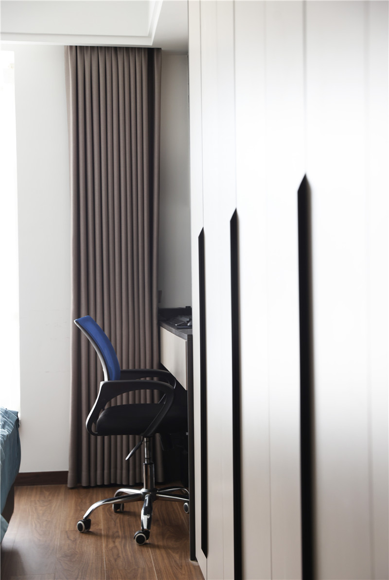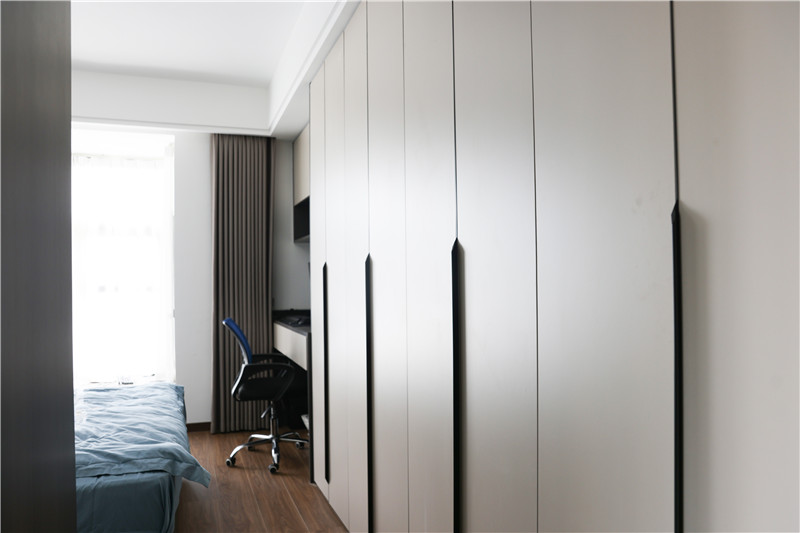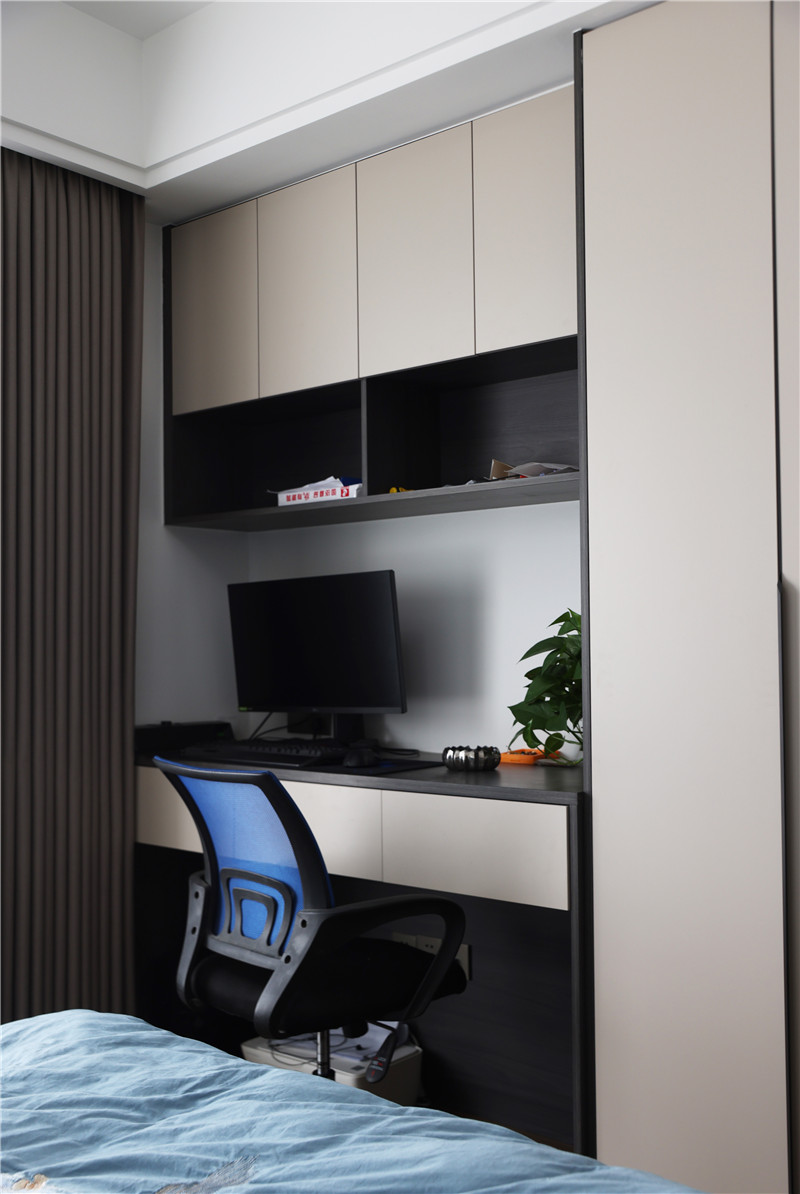 靠墻打一整面一柜到頂式衣柜,將其用作衣帽間+書(shū)桌,預(yù)留開(kāi)放掛衣區(qū),滿足日常使用習(xí)慣;選用一字型長(zhǎng)條拉手,視覺(jué)上簡(jiǎn)潔、時(shí)尚。