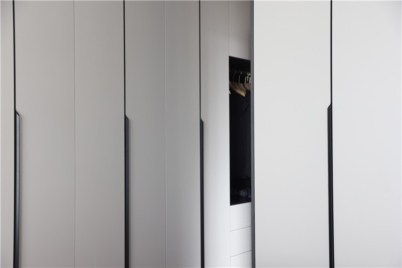 靠墻打一柜到頂式衣柜,選擇一字型長(zhǎng)條拉手,茶白色經(jīng)典熱門(mén),放在臥室舒適自然。
