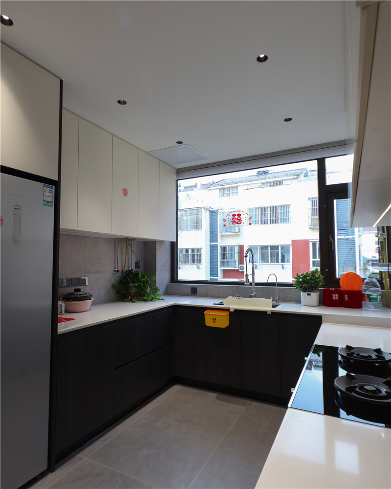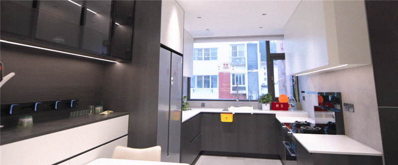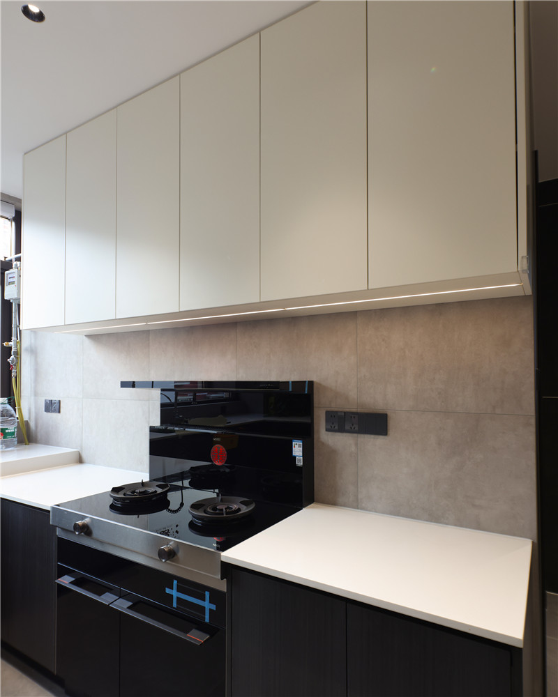 廚房U字型布局,遵循洗→切→烹→盛的動(dòng)線,便捷且收納力強(qiáng);櫥柜箱體及吊柜采用無拉手設(shè)計(jì),視覺清新;整體臺面巖板運(yùn)用,耐磨防滲水;冰箱與柜體組合,協(xié)調(diào)整體空間布局。