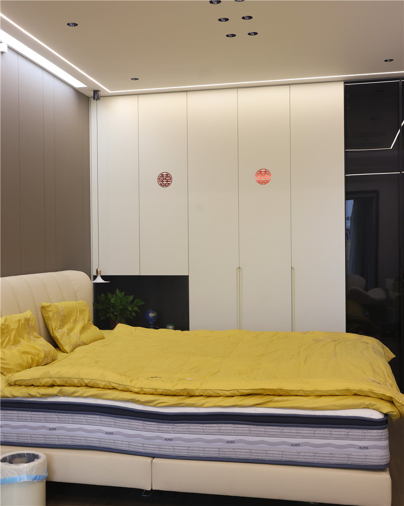 臥室一側(cè)整面立柜,配合銑槽拉手簡約利落;梳妝臺抬高設(shè)計(jì),融入圓弧造型,典雅溫柔;整體空間主燈與輔燈相結(jié)合式設(shè)計(jì),空間層次感強(qiáng)。