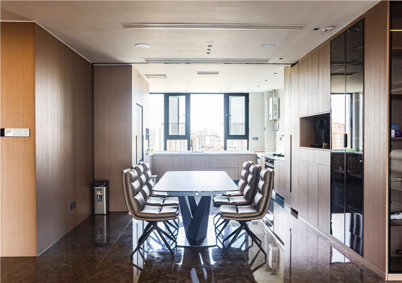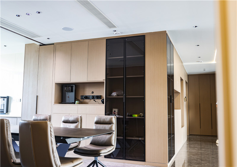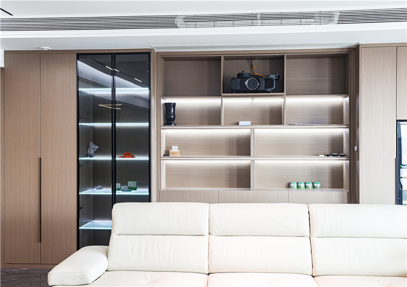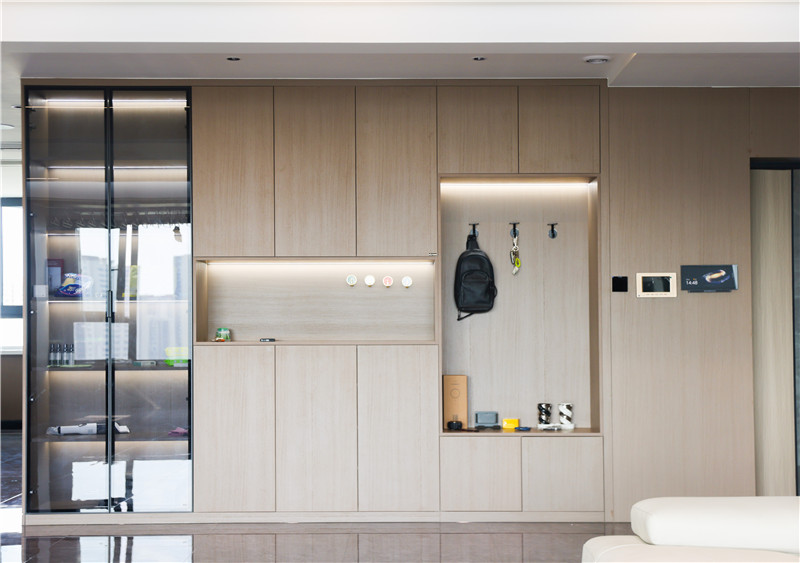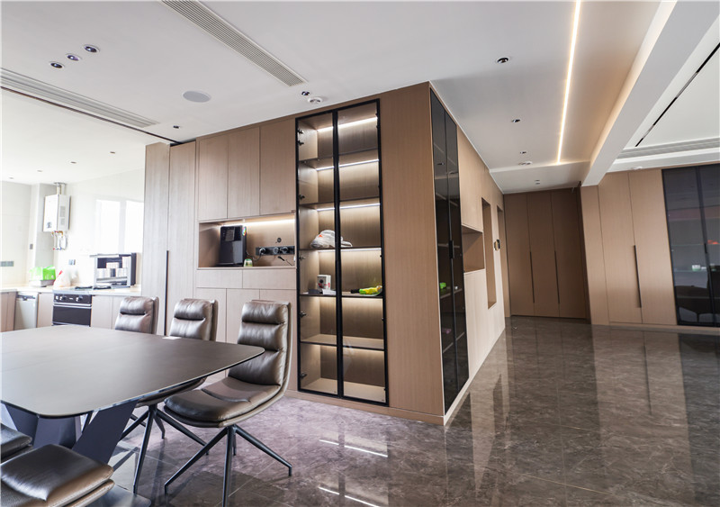 全屋選用科技直紋與莫蘭迪系列,工藝的運(yùn)用凸顯木質(zhì)紋理的高檔家具材質(zhì);整體門(mén)墻柜一體化設(shè)計(jì),視覺(jué)上和諧統(tǒng)一;藏露相宜的一柜到頂式收納柜將酒柜內(nèi)嵌,合理增加使用功能又不占空間;黑玻與燈帶的搭配在原木風(fēng)基礎(chǔ)上增添“低調(diào)的奢華”。