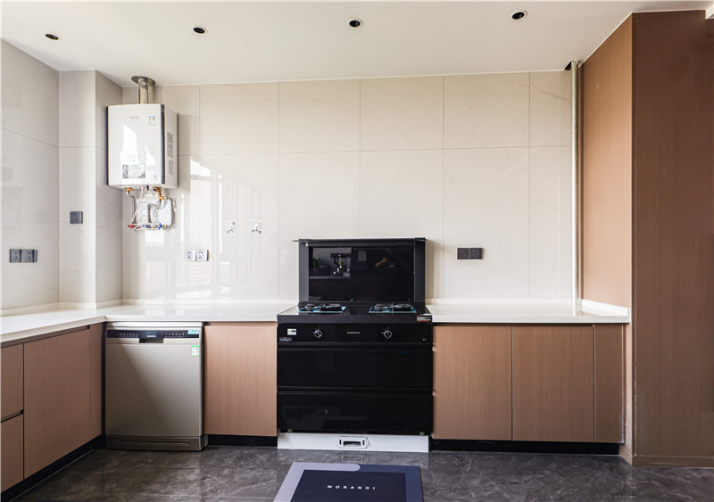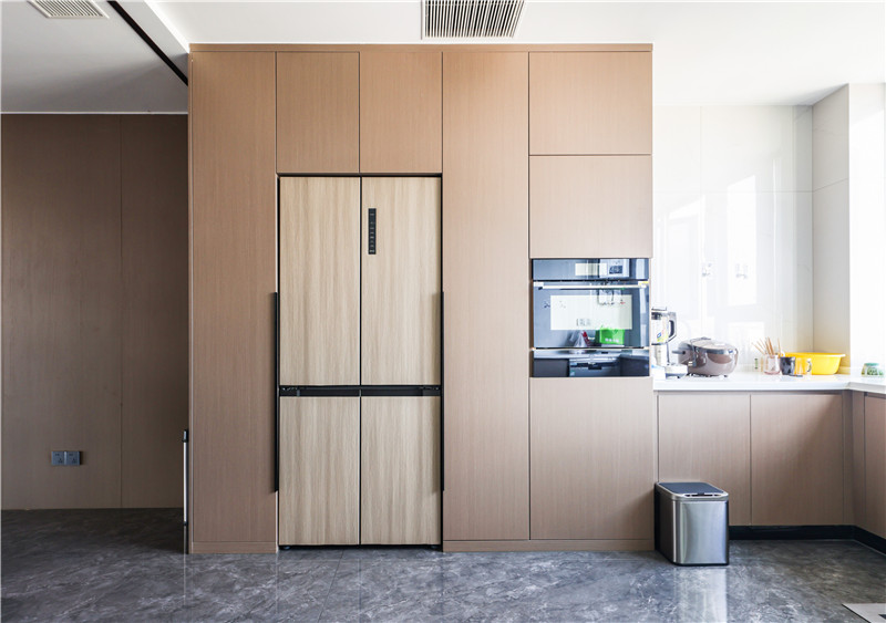 餐廚一體化設(shè)計(jì),增強(qiáng)家人用餐的互動(dòng);U型設(shè)計(jì)將櫥柜與餐邊柜結(jié)合,增強(qiáng)收納功能;統(tǒng)一的原木風(fēng)餐邊柜與櫥柜,營(yíng)造柔和、舒適的感覺(jué);原木色是溫暖明亮的顏色,用在餐廚處,打磨歲月安寧感,靜靜享受美食別有一番風(fēng)味。