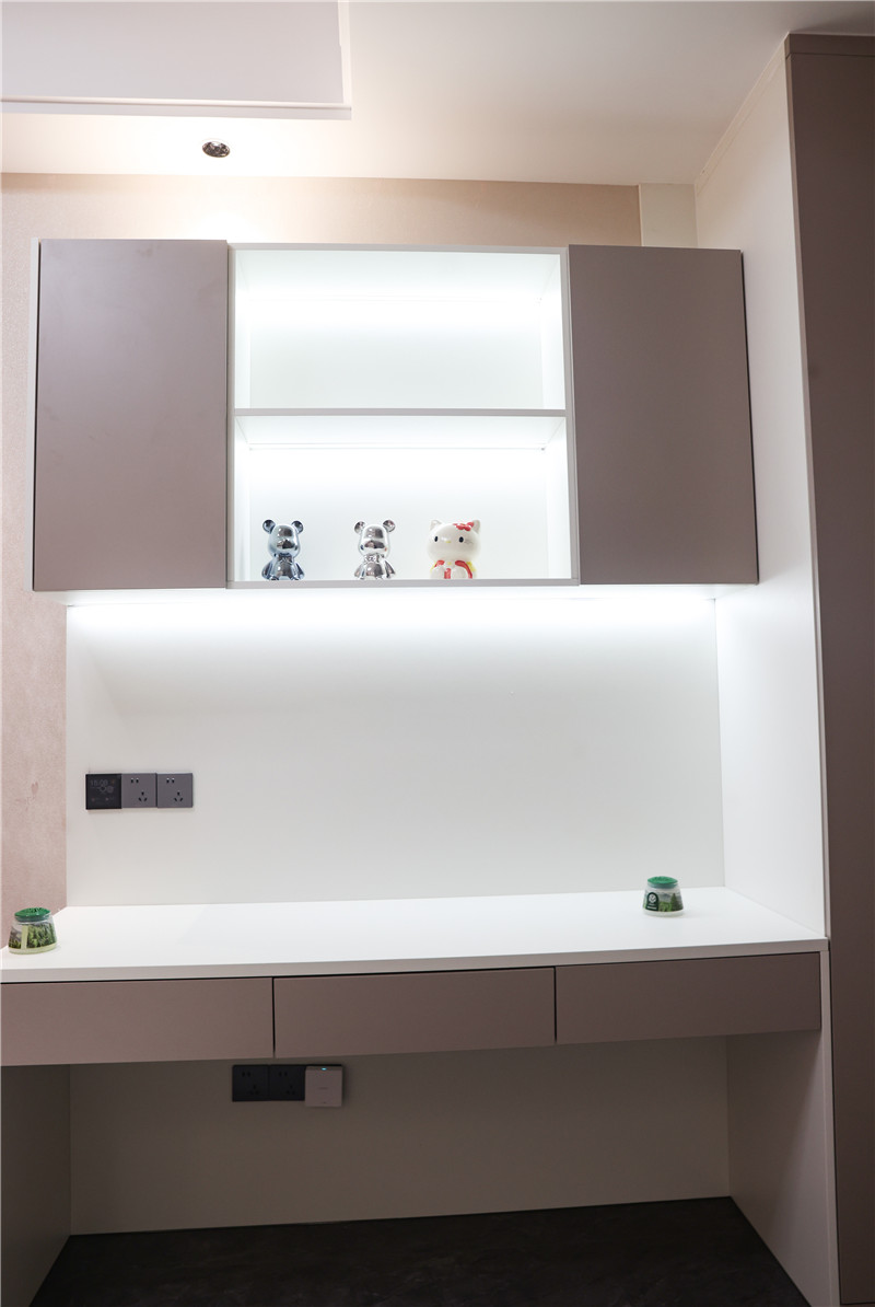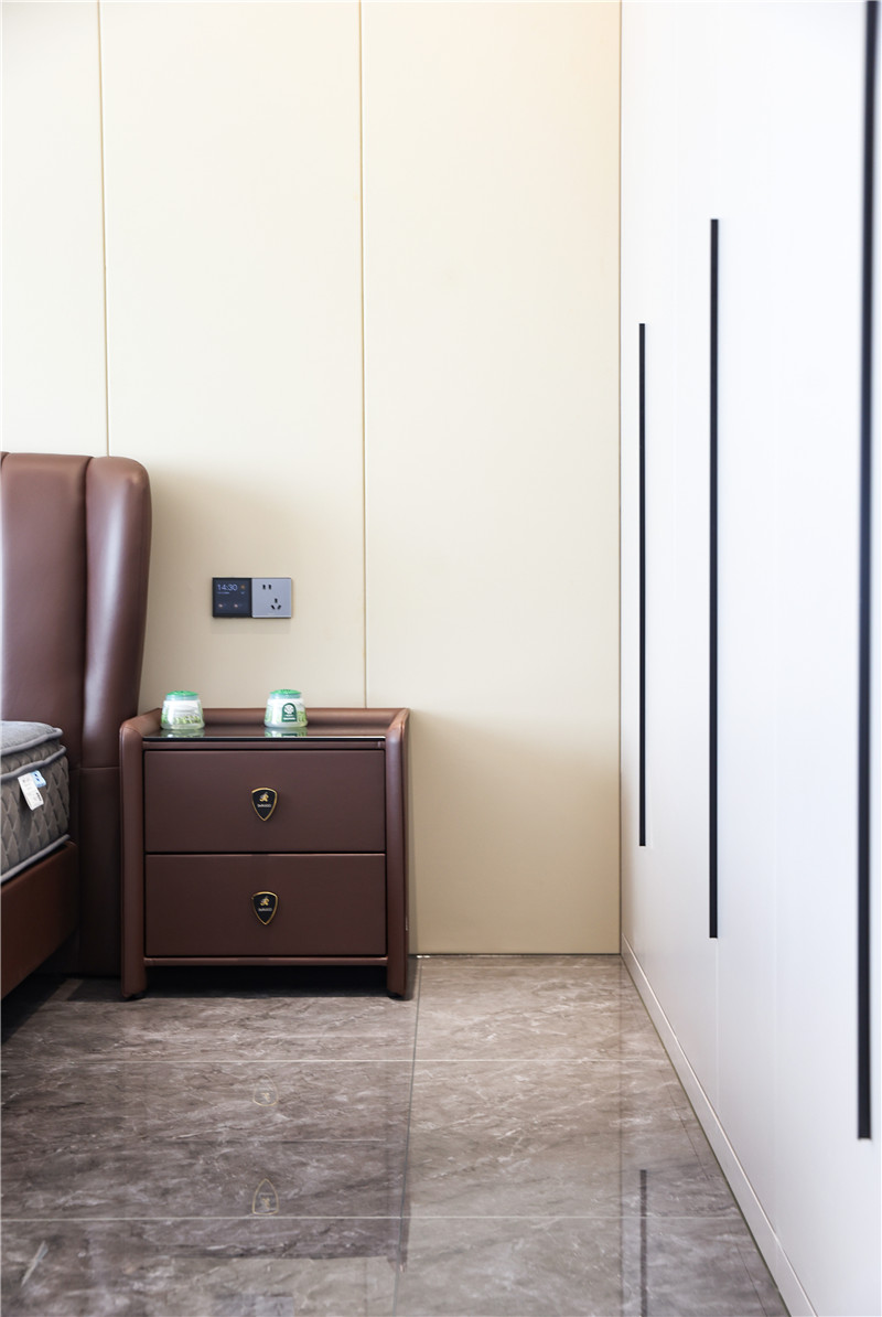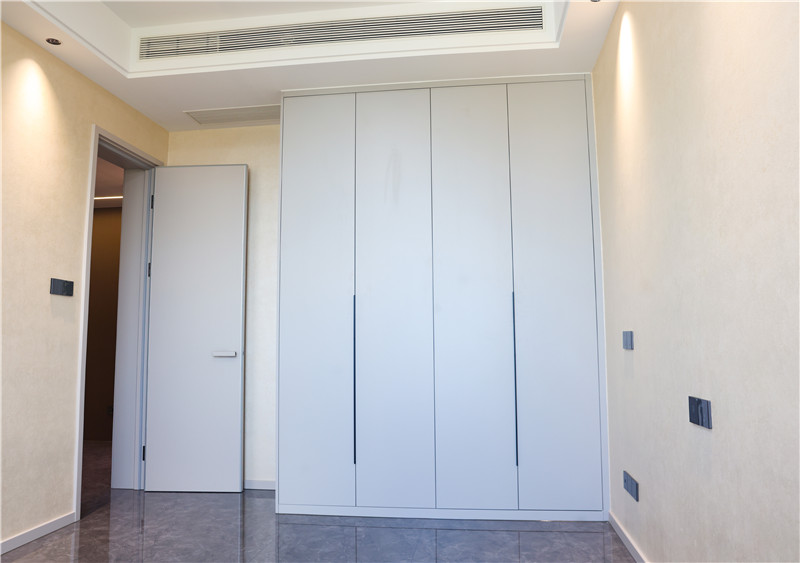 臥室簡(jiǎn)約流暢的線條設(shè)計(jì)與低調(diào)的配色,達(dá)成屋主想要的簡(jiǎn)單舒適氛圍;一柜到頂式與一字型長(zhǎng)條拉手簡(jiǎn)潔美觀,無(wú)主燈設(shè)計(jì)使空間更加干凈;部分留白讓人充滿遐想,在睡夢(mèng)中遨游,感受舒適與自由。