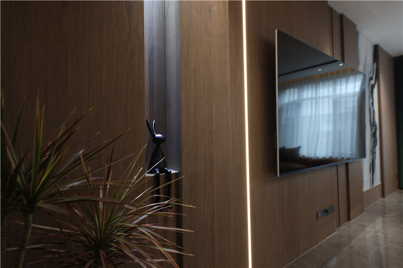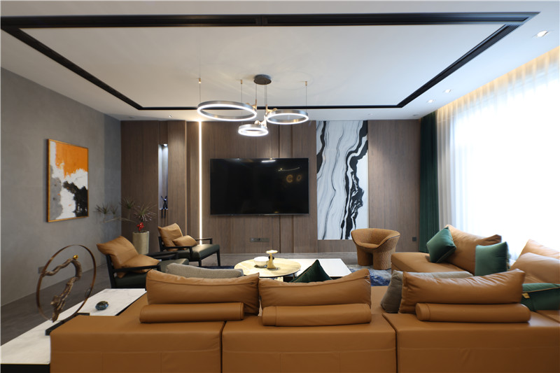 整面木質(zhì)電視背景墻,引入金屬線條、裝飾構(gòu)造,多種層次造就別樣魅力;藝術(shù)主燈+射燈+條帶燈,氛圍感不言而喻;L型沙發(fā)配合圓弧茶幾與方形底座,便捷舒適。