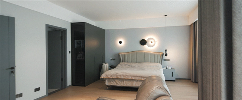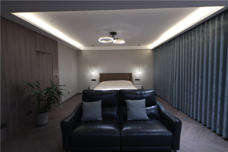 主人房:遵循主人喜愛的對(duì)稱設(shè)計(jì),包含床頭柜、床頭燈、沙發(fā)等,干凈利落;整體色調(diào)不搶眼卻彰顯韻味;隱形推拉門的運(yùn)用,視覺平和。