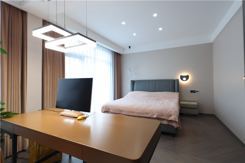 女兒房:一體化設(shè)計(jì)+藏八露二原則,整潔清爽;水洗灰柜門結(jié)合黑玻,美感在線;書桌隱藏式按彈抽屜,給人以膚感