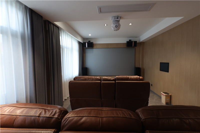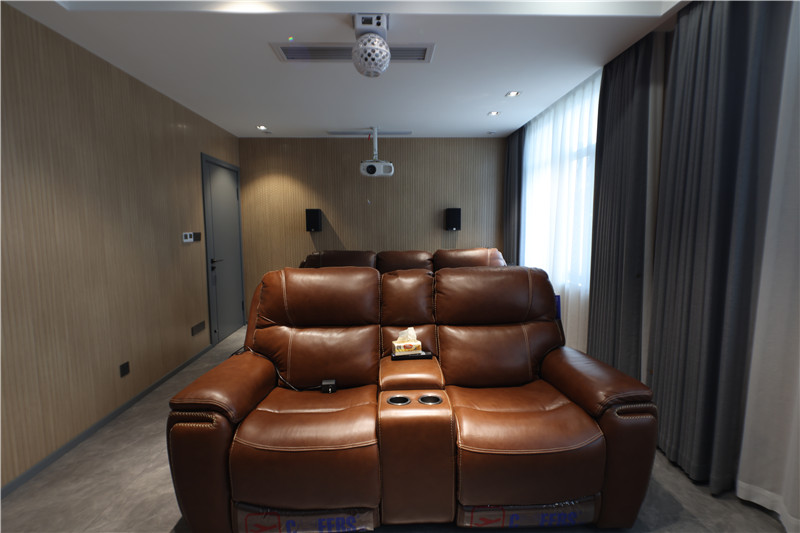 墻體整面背景墻,以木材的溫潤(rùn)感成就舒適空間;以投影代替電視機(jī),布局合理;這樣的空間還能作為多功能房使用,分散壓力。