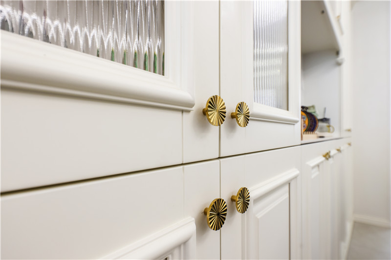 本案例中,柜類采用水漆工藝,0醛添加 0苯添加的環(huán)保屬性下,呈現(xiàn)出產(chǎn)品的高級質(zhì)感;柜體為芬蘭白色調(diào)、柜門為極光色,給人以溫暖治愈之感;造型板設(shè)計+太陽花拉手,古典高貴。