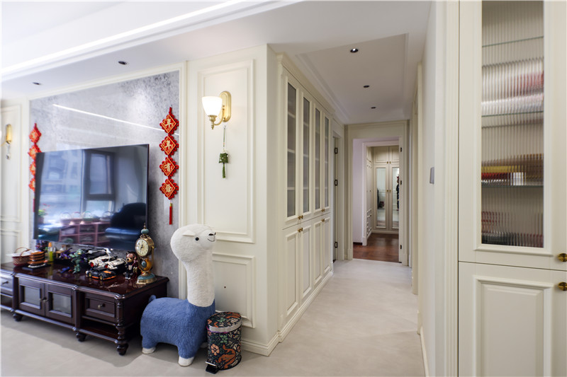入戶玄關(guān)柜為整面到頂構(gòu)造,協(xié)調(diào)整體家居動線、自然美觀;暖色系燈光、凹凸有致的玻璃等元素加入,營造出溫馨氛圍。